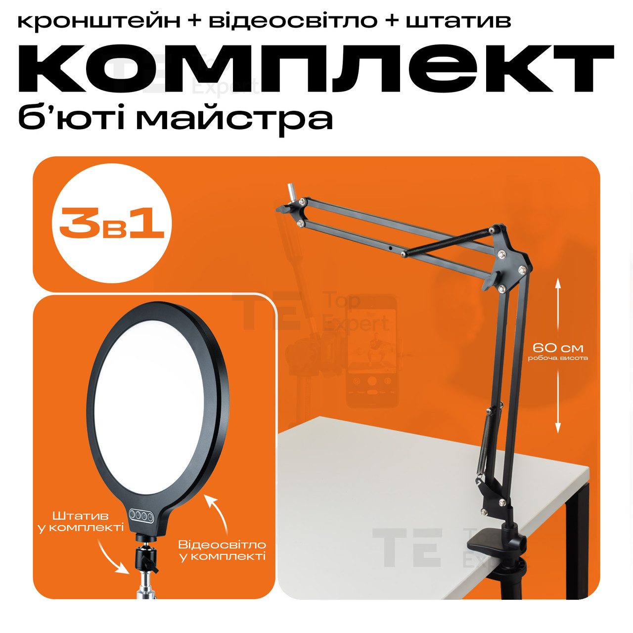 Комплект 3 в 1: лампа VAS-01 18W зі штативом 2,1 м і пантографом Type 35 B для телефону — це універсальний набір, який підійде як для фото- і відеозйомки, так і для роботи візажистів, майстрів манікюру, стрімерів і контент-креаторів. У набір входить потужна LED-лампа з USB-живленням, штатив 2,1 м і пантограф для кріплення телефону, камери, лампи або мікрофона. Цей комплект легко адаптується під будь-які завдання, забезпечуючи зручність і якість.